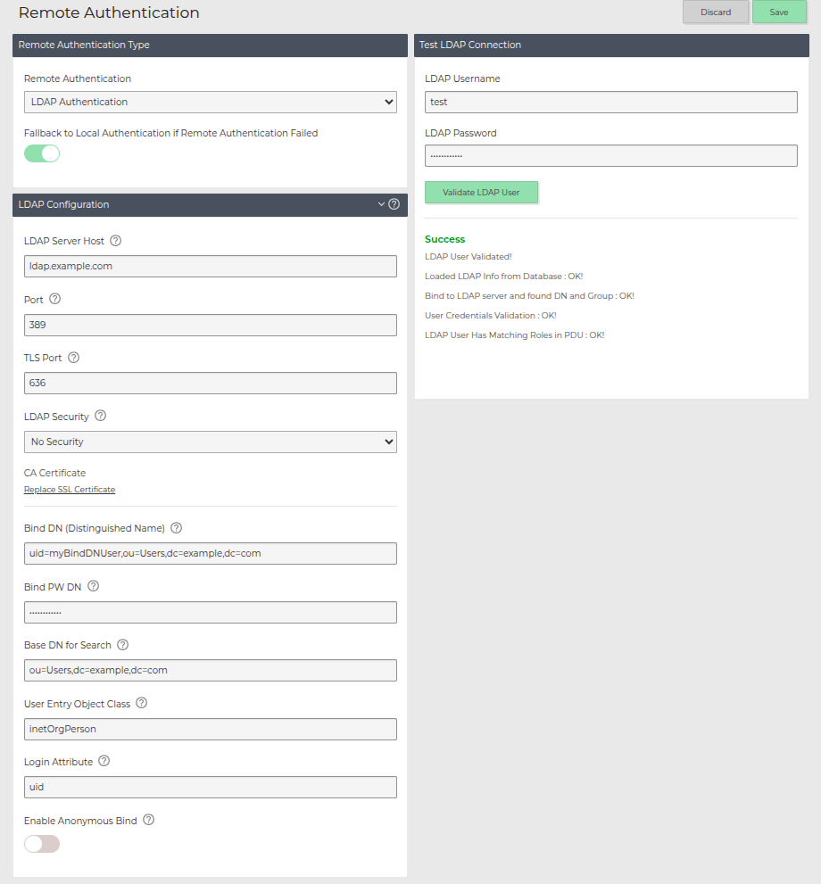 Important: To remotely validate users using LDAP, the PDU searches the user in the LDAP directory. When LDAP user entry is found, the PDU will check for the user's 'memberOf' attribute to determine its group membership. The LDAP user's membership must match at least one user role in the PDU in order to determine its permissions.